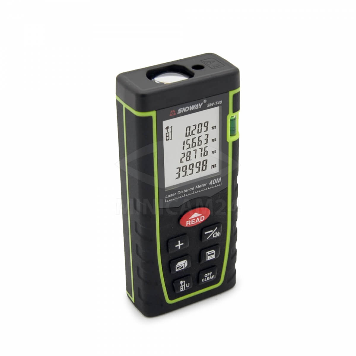 Портативный прибор для измерения расстояний от 0.2 до 40 метров. Прибор предназначен для профессионального использования при выполнении строительных работ и использования в быту. Точность измерения расстояния не хуже +/- 2 мм. Кроме измерения расстояния прибор способен вычислять площадь, объем, вычитать и суммировать полученные результаты. Для вывода результатов прибор оснащен ЖК дисплеем с подсветкой. Корпус прибора защищен от атмосферных воздействий по классу защиты IP 54 Для питания прибора используются два элемента формата АА (нет в комплекте).